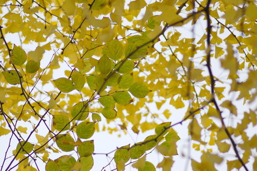 黄緑と黄の葉の色の組み合わせがいいな、と思って撮りましたが、右の方にぼんやり写りこんでいる枝が邪魔ですね。。